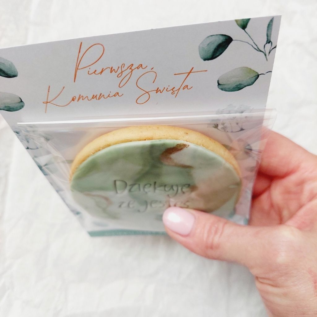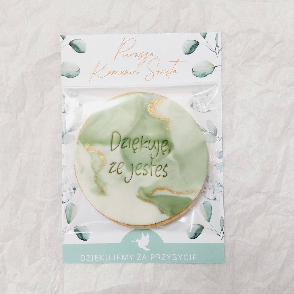 Ciastko okrągłe, w woreczku na kartoniku, z napisem “Dziękuję, że jesteś”, dekorowane złotem.